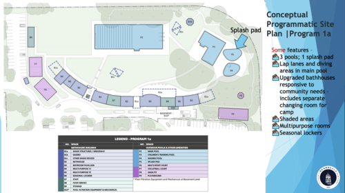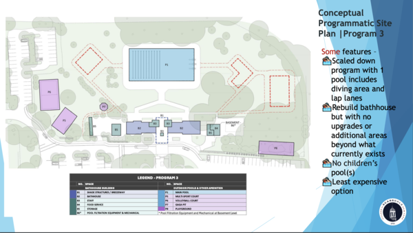 Program 1, the most posh, would include a full indoor pool complex, three seasonal pools, a splash pad, nicer bathhouse facilities, community spaces, and a place to get a bite, among other amenities.