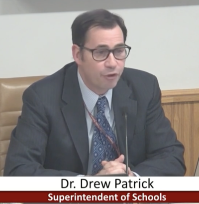 Superintendent Dr. Drew Patrick answers affirmatively when asked by a parent whether it’s really necessary that students supply their own desks from now on.